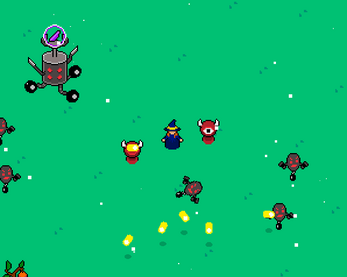 staffs would be a unique upgrade to your turrets as a flat increase in a stat or two, hats should shake up the game, but have a drawback. magic gems could be dropped by enemies, or mined, giving a temporary boost, and a broom over a staff increasing speed and allowing two extra fruits or a turret to follow you.